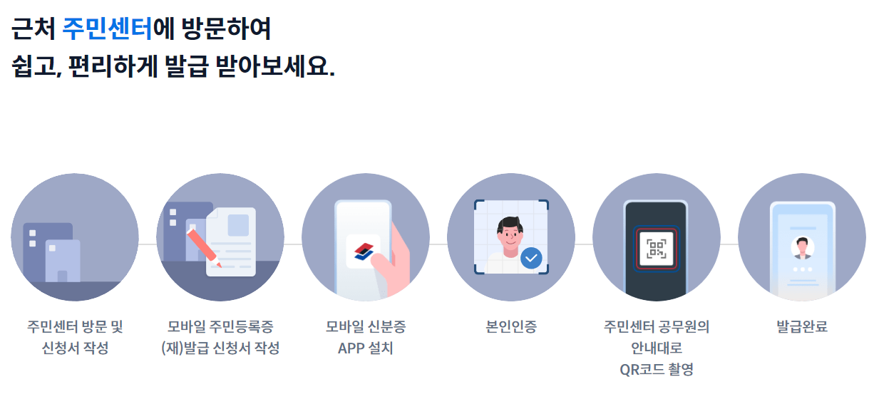 읍·면·동 주민센터를 방문하여 모바일 주민등록증 발급을 신청하는 방법입니다.